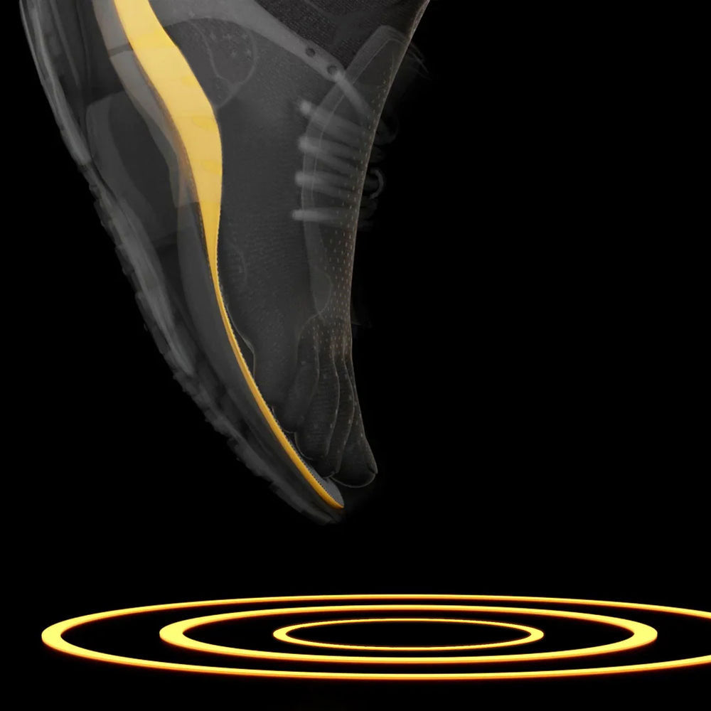 At heel strike, the carbon fiber baseplate absorbs impact, reducing the joint load on the lower extremities.